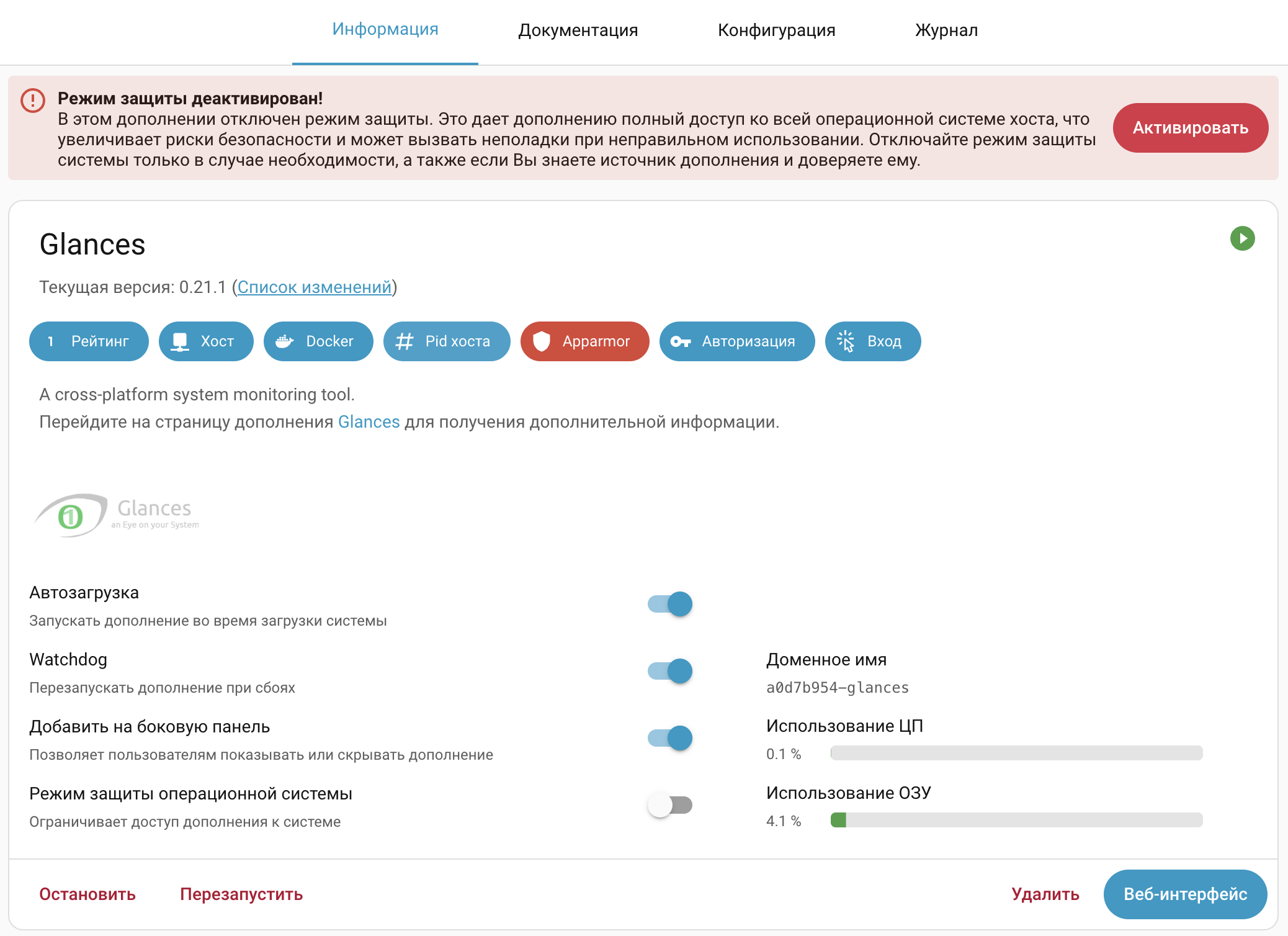 После отключения Protection mode и применения необходимых параметров страница дополнения будет выглядеть примерно так, как на изображении ниже. Это пример корректно настроенного Glances.