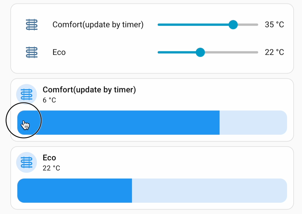 Для этого в карточку добавляется отслеживание начала и окончания перемещения ползунка (pointer events). Пока пользователь удерживает ползунок, внешние обновления значения игнорируются. После завершения взаимодействия синхронизация со state сущности восстанавливается.